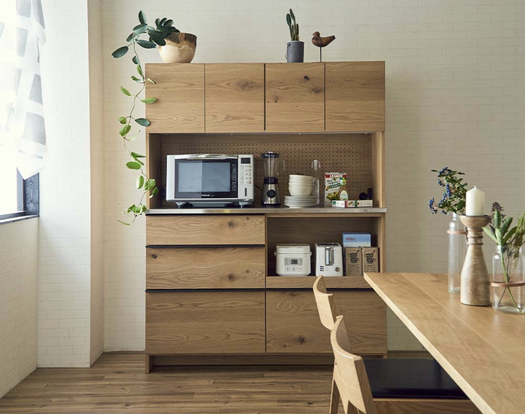幅90cm〜120cmのキッチンボードは、収納力と作業性のバランスが優れたスタンダードなサイズです。引き出し・扉収納・家電収納スペースが一体化されており、「見せる収納」と「隠す収納」を使い分けたいニーズにも応えられます。カウンター部分に余裕があるため、ちょっとした下ごしらえや配膳スペースとしても活用可能。