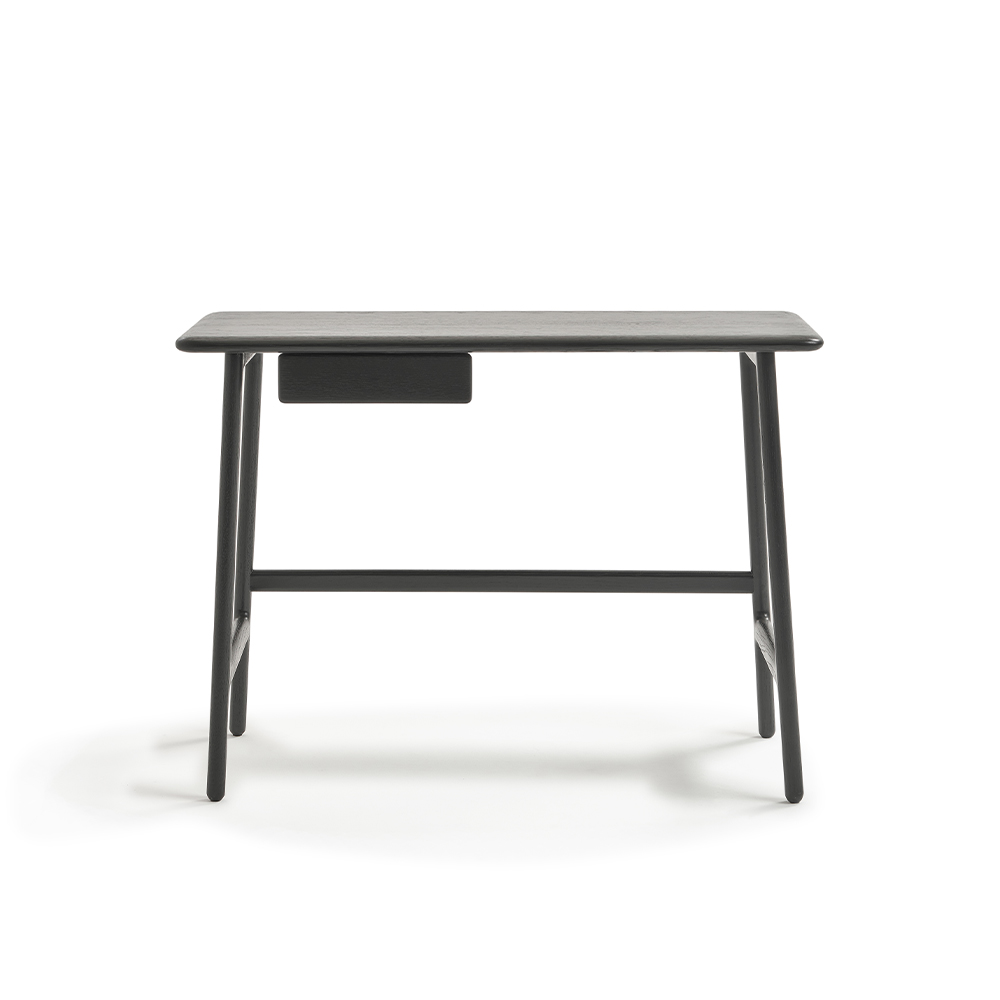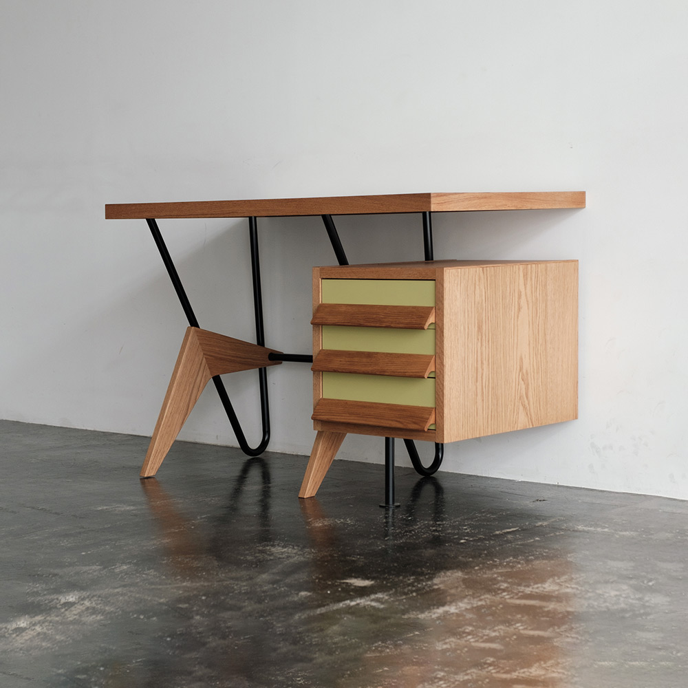 3段の引き出しはノートPCや書類をすっきり収納できる設計で、天板にはメラミン化粧合板を採用し、実用性も備えています。ブーメランのように美しくカーブした脚部は、クラシックとモダンが共存する唯一無二の存在感を放ち、ワークスペースを印象的に彩ります。