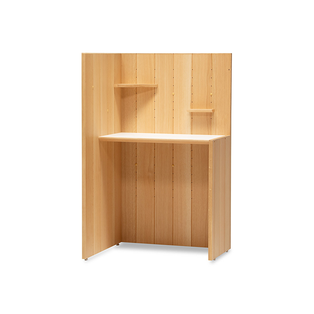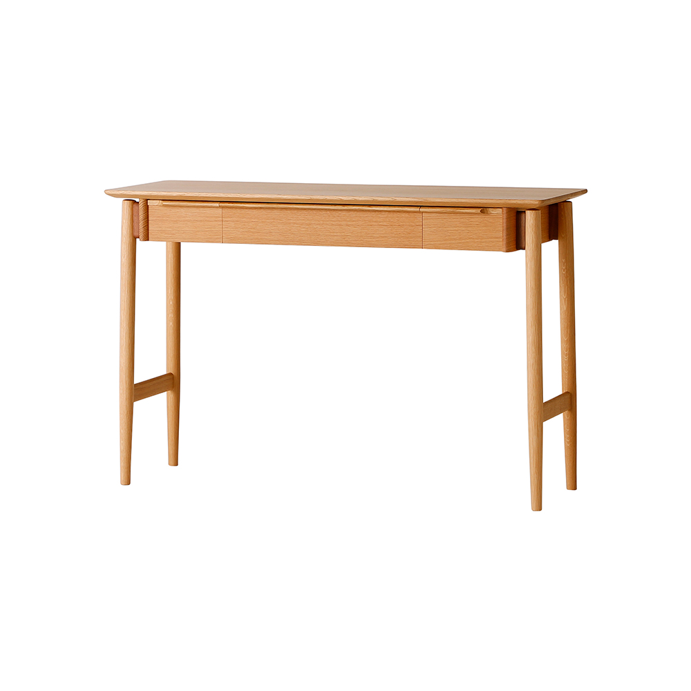 木のぬくもりを感じるナチュラルな素材は、使うほどに風合いを増し、「仕事のための家具」ではなく「暮らしの一部」として長く寄り添うデスクに仕上がっています。収納やガジェット整理といった機能面にも配慮され、どんな空間にも自然と溶け込む一台です。