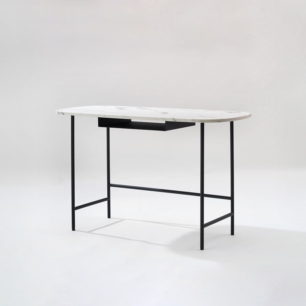 moda en casa(モーダエンカーサ)の「CAPSULE desk」は、大理石柄の天板が上品に映えるコンパクトデスク。プリント仕上げのため扱いやすく、気軽に高級感を取り入れられます。シンプルなスチール脚が軽やかで、天板下のオープントレイにはタブレットや文具を収納可能。