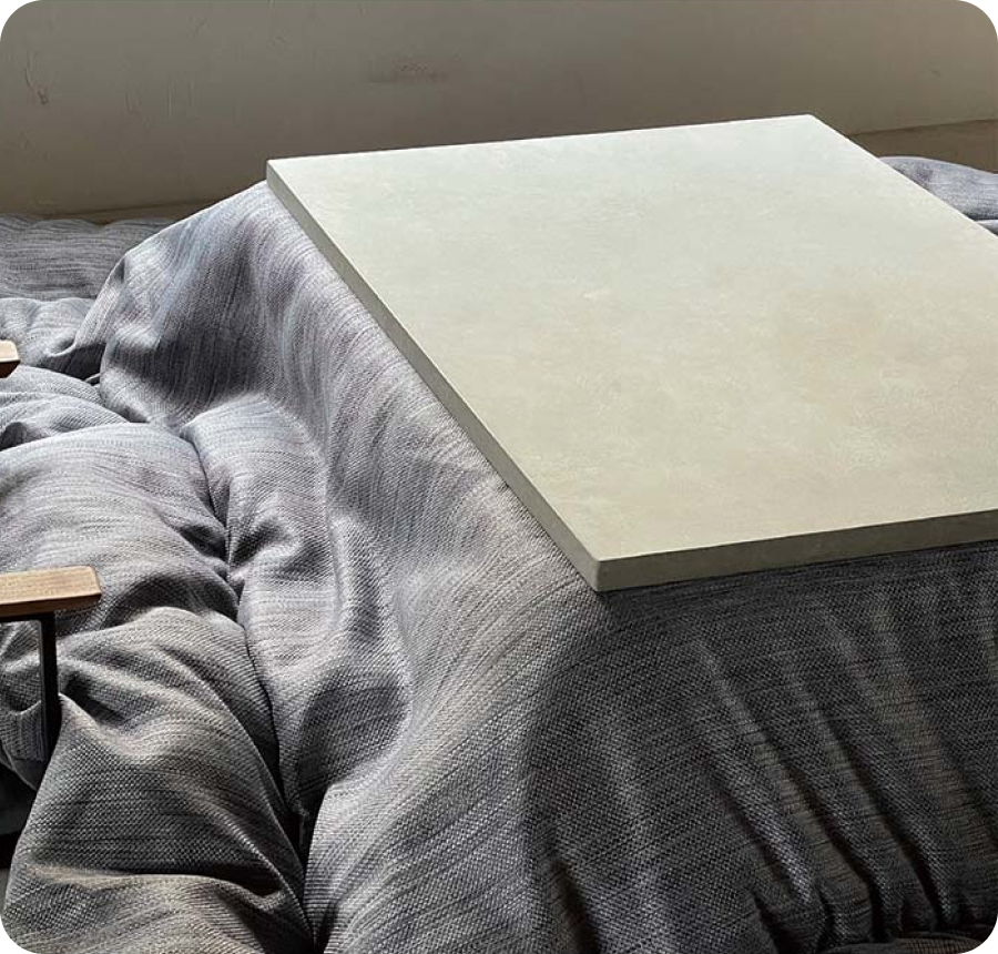 一見するとこたつには見えない、スタイリッシュなデザインのテーブルです。モルタル調の天板と木製の脚部を組み合わせた独自のデザインは、空間に個性と洗練された印象をもたらします。天板にはざらりとした質感を施し、実際のモルタルの風合いを忠実に再現しました。存在感のある太めの脚部が安定感と重厚感を演出し、上質な雰囲気を高めています。冬の季節にはこたつとして快適にご使用いただけるほか、春夏秋にはリビングテーブルとしても違和感なくお使いいただけるため、年間を通して活躍するアイテムです。モダンなインテリアにも自然に溶け込み、機能性とデザイン性を兼ね備えた一台となっています。