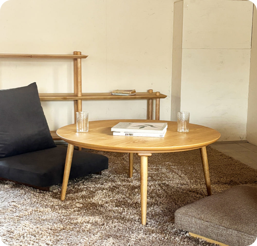 円卓型のこたつテーブルです。伝統的なちゃぶ台のフォルムを踏襲しながらも、無垢材を使用することで高級感を漂わせ、モダンな印象に仕上げています。従来のこたつにありがちな野暮ったさを感じさせず、洗練された空間に自然に溶け込むデザインです。 脚部は内側に配された構造で、全体をスタイリッシュに見せるだけでなく、座った際にも快適にご使用いただけます。また、無垢材ならではの魅力として、使い込むほどに色艶が増し、深みのある表情へと変化していく経年美化も大きな特徴です。 現代のライフスタイルに寄り添いながらも、長く愛用できる新たな定番の一台としておすすめです。