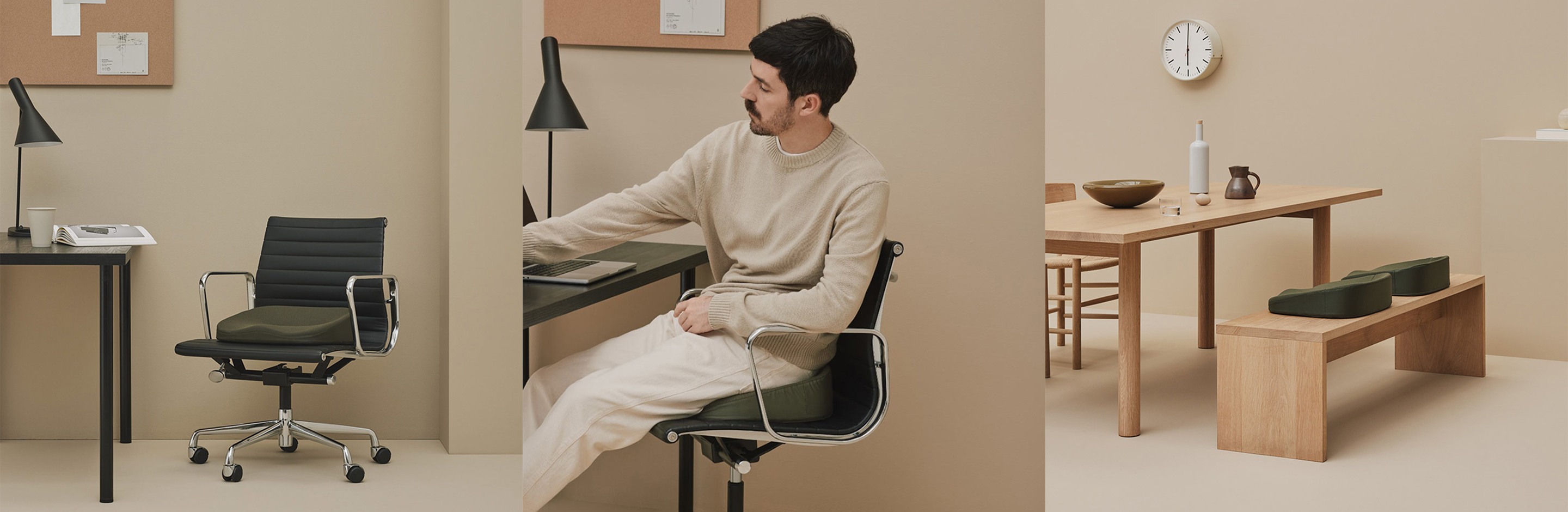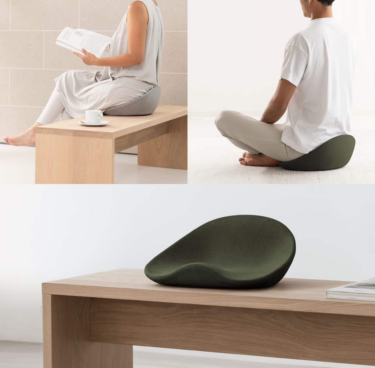 お尻と骨盤にかかる体圧を分散し、身体への負担を軽減します。ゆったりサイズのシンプルなスクエア形状は、オフィスチェアとも調和し、デスクワークなど長い座り時間も快適にサポートします。