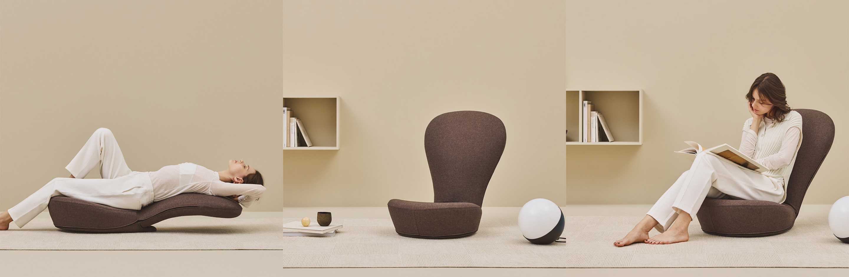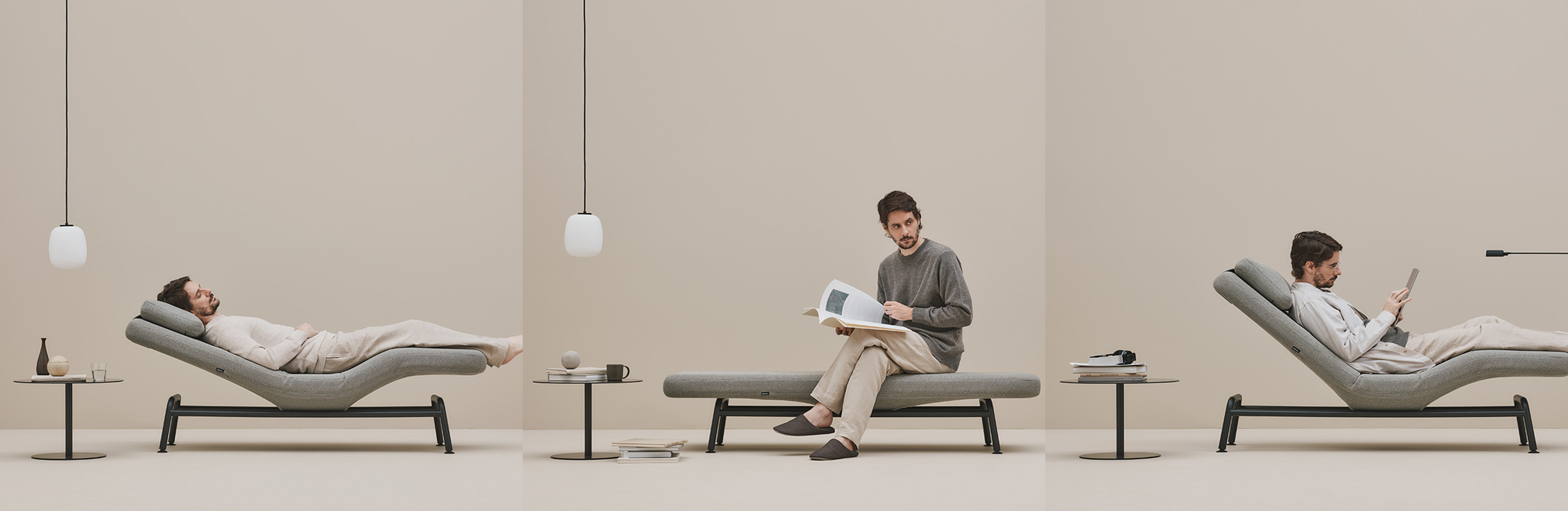 フラットなベンチから寝椅子、ラウンジチェアへと変形する電動ソファベンチ。