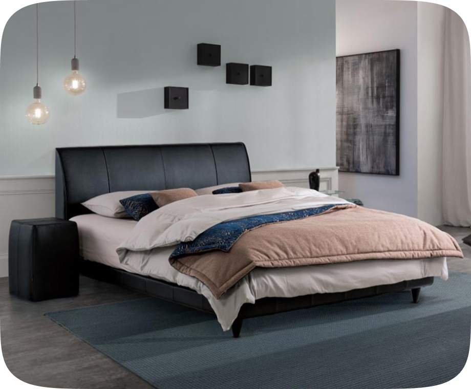 ドイツデザイン協議会主催のICONIC AWARDSを受賞した、洗練された存在感を放つベッド。 スリムでしなやかなフレームと、直線美が際立つサイドフットが軽やかな印象を生み出します。ヘッドボードは装飾を抑えたミニマルな造形で、サイドに載せる構成により浮遊感のある佇まいを実現。 RUF BETTENならではの上質な張り仕上げと、マイスターの手仕事が生む快適な寝心地が、寝室に静かな緊張感と上質な安らぎをもたらします。