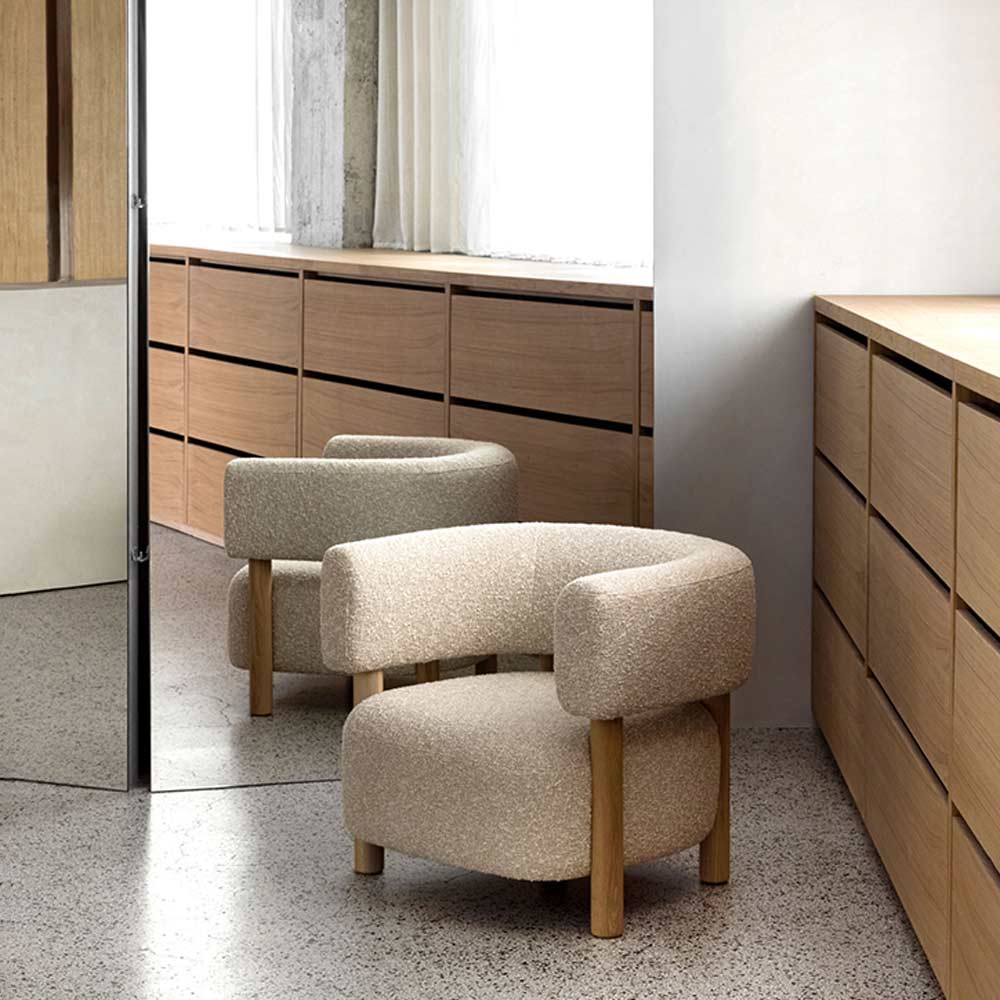柔らかい張地と無垢材で作られた円筒形の脚に支えられたバックレストの構成が、方向を制限せず、暖かい気配をもたらすデザインを実現しています。