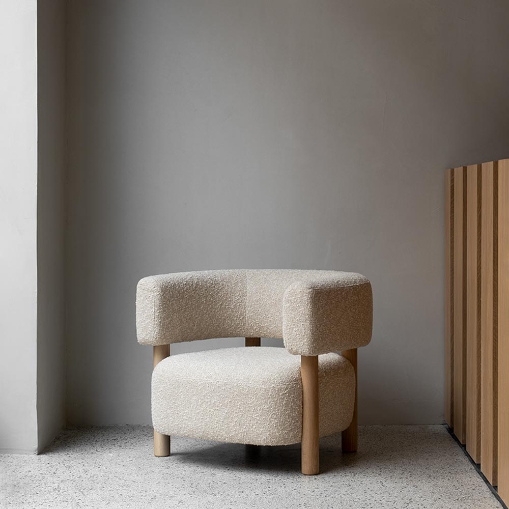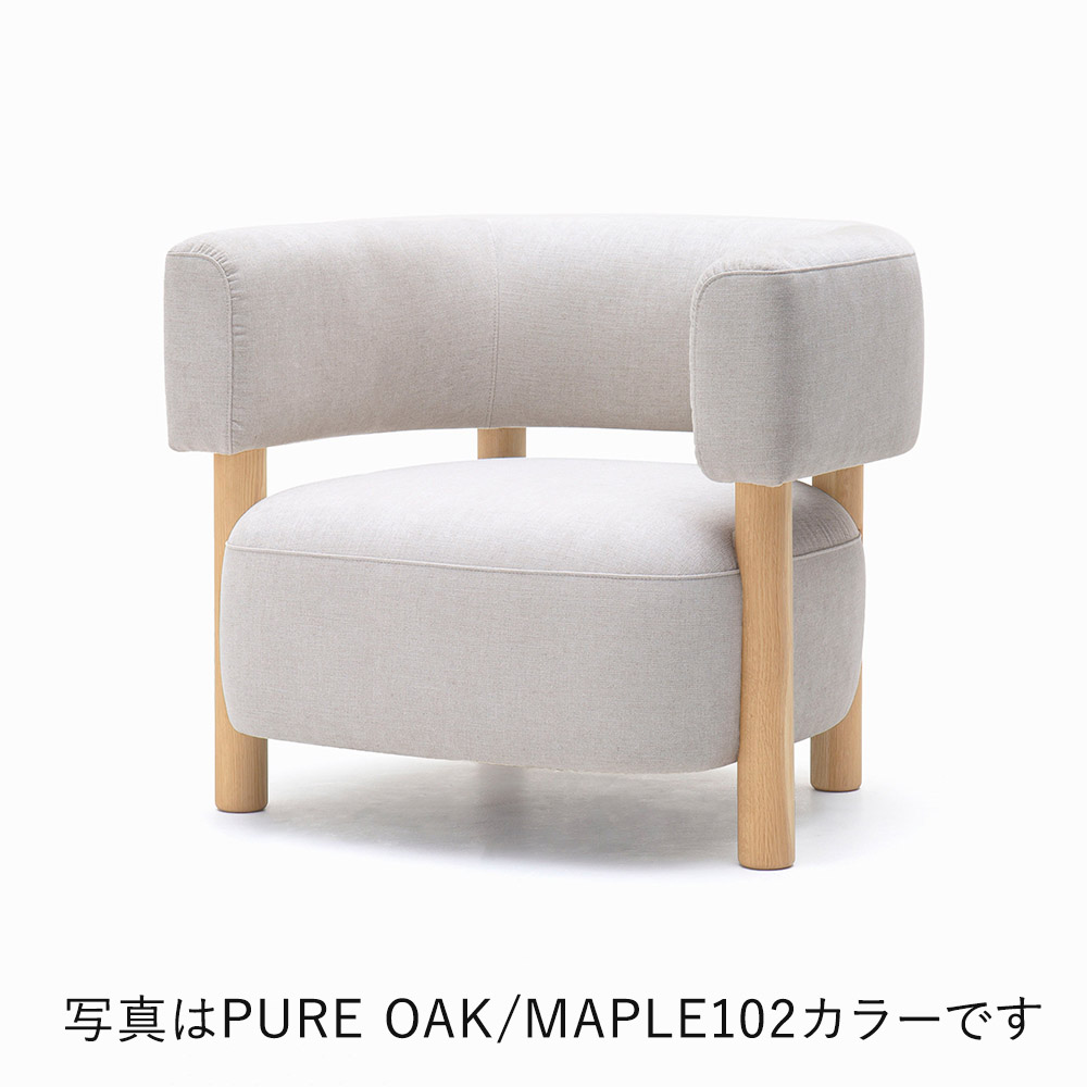 柔らかい張地と無垢材で作られた円筒形の脚に支えられたバックレストの構成が、方向を制限せず、暖かい気配をもたらすデザインを実現しています。