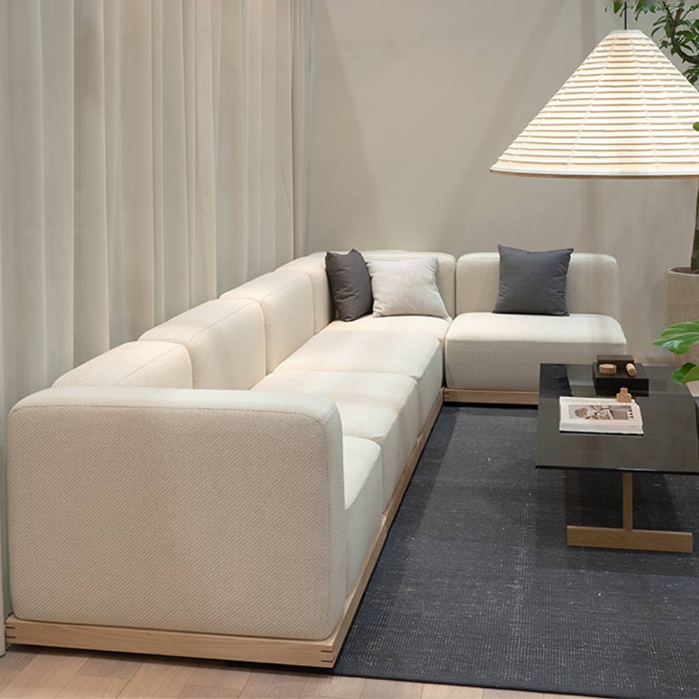 N-S02のモジュラーソファは、丈夫な木製のベースと柔らかな布地でできています。
