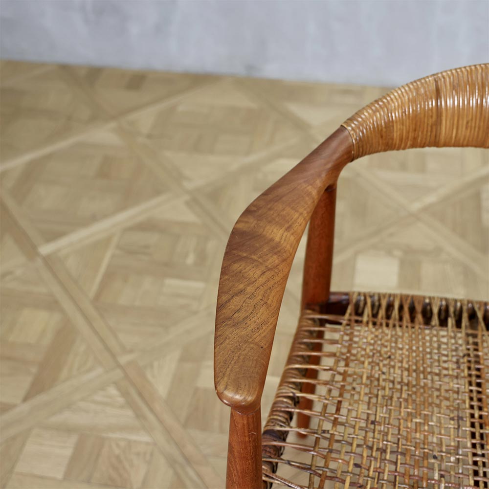 こちらはその中でも特に希少価値の高い初期のモデルとなっており、背もたれに籐が巻かれたタイプと、今では見られない当時の上質なチーク材がベストマッチな逸品となっております。