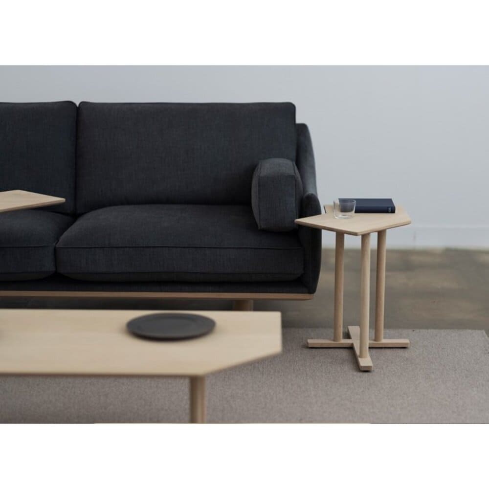 個性的な形のサイドテーブルはワークテーブルと同様に少し角度を振る部分を作ることで、感覚的に人に寄り添うものになっています。