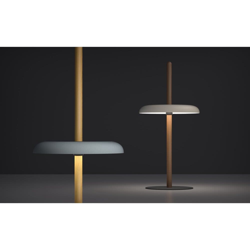 照明モジュールをオークかウォルナットの無垢材でできた支柱に取り付け、その上にマット仕上げのパウダーコーティングで落ち着いた色彩に仕上げたスチール製シェードやトレイを設置することで、下方に美しく広がる灯りを提供します。