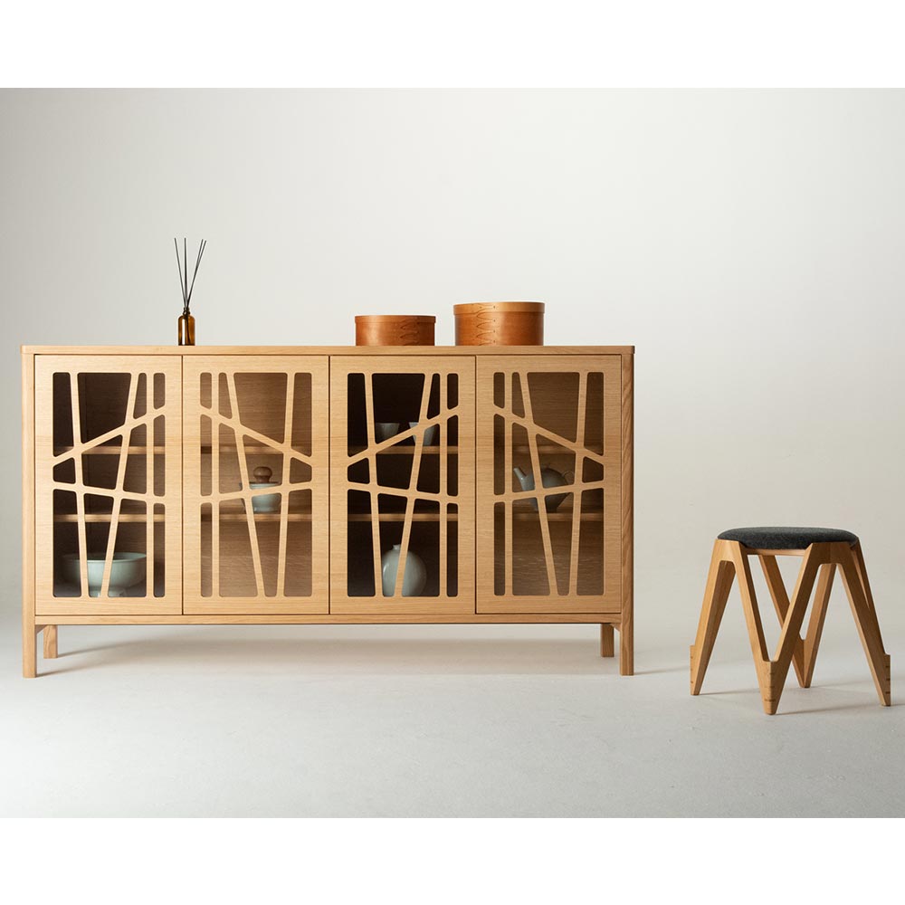 お気に入りの物をしまっても、全てを見せず、美しい木目と相まってひと味違った面影に。同じシリーズの家具と合わせますと、洗練されたデザインが響き合い、お部屋全体に統一感と、自然の温もりが感じられる空間が生まれます。