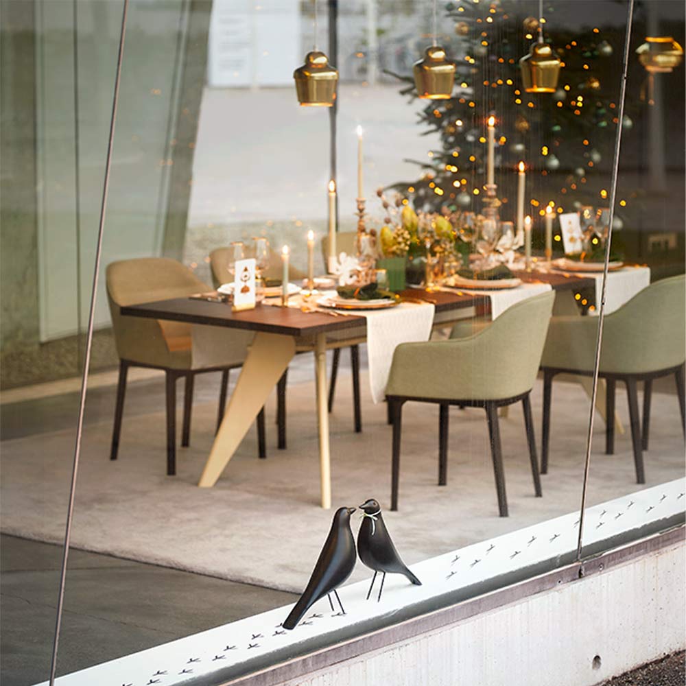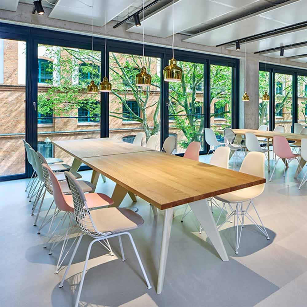 傾斜のついた脚は天板の下に沿ったバーと連結し、天板にかかる重さを床へ逃がせる構造になっています。
